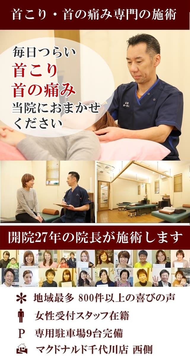 「首こり」や「首の痛み」は薬をのんでも、自分で首を揉んでも、なかなか良くならないことが多いですよね。