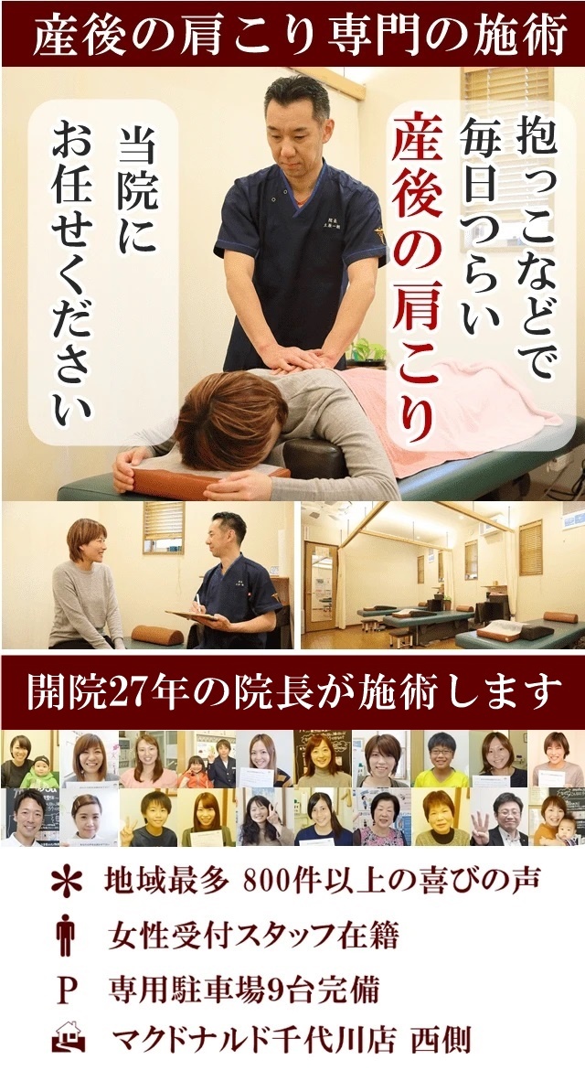 大丈夫ですよ!当院には、「産後の肩こり」でお悩みの方が多く改善されています。
